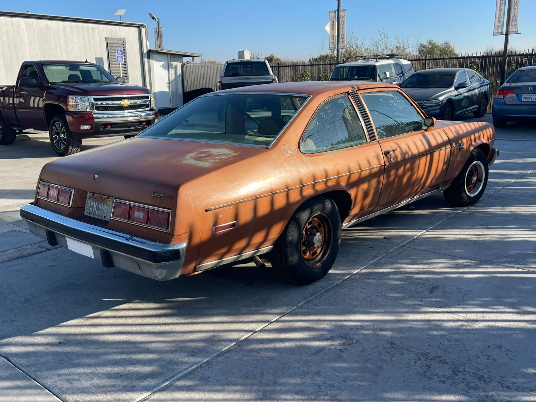 MAKE: CHEV || MODEL: NOVA || YEAR: 1978 || TITLE: SALV T/DONATION || VIN: 1Y27U8W120146 || MILES: 050297 || ENGINE: 8CYL/5.7L || COLOR: ORANGE || KEYS: Yes || *Green Light