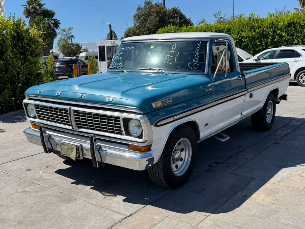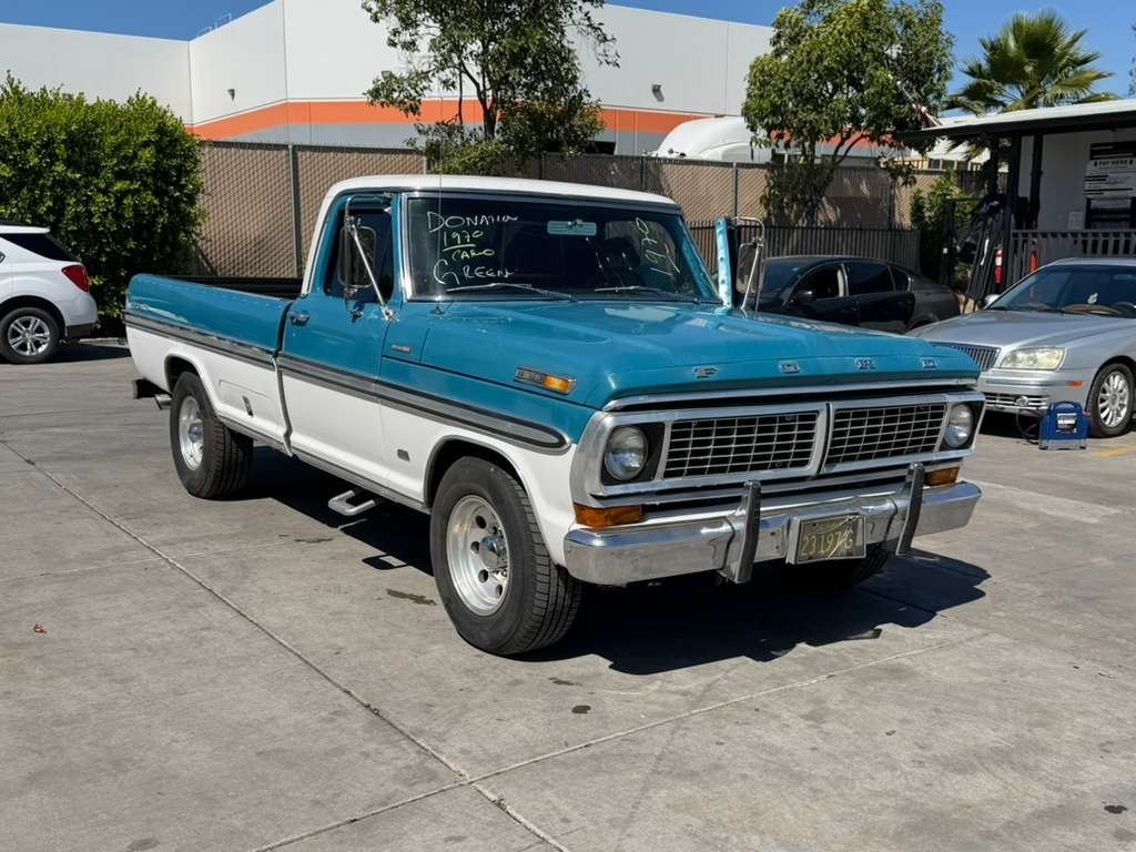 MAKE: FORD || MODEL: F-100 || YEAR: 1970 || TITLE: T-DONATION || VIN: F254RJ31120 || MILES: 083172 || ENGINE: 8 CYL / 5.0 L || COLOR: BLUE/WHITE || KEYS: Yes || *Green Light