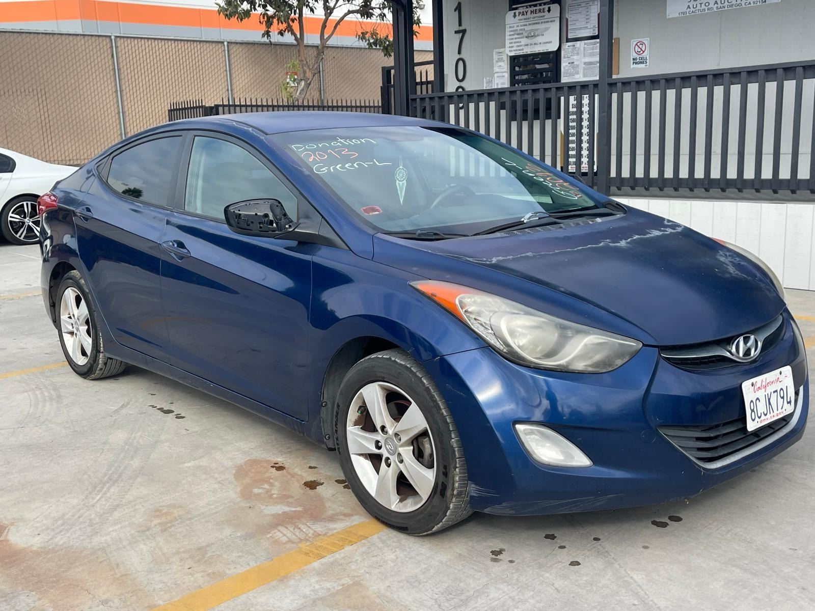 MAKE: HYUN || MODEL: ELANTRA || YEAR: 2013 || TITLE: T-DONATION || VIN: KMHDH4AEXDU566737 || MILES: 181410 || ENGINE: 4 CYL / 1.8L || COLOR: BLUE || KEYS: Yes || *Green Light